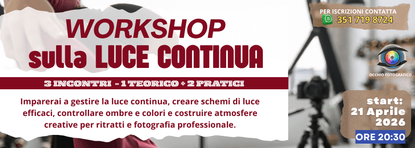 Scopri come trasformare la luce in uno strumento creativo e professionale con il nostro Workshop sulla Luce Continua, un percorso pensato per chi vuole migliorare concretamente la qualità dei propri scatti ✨